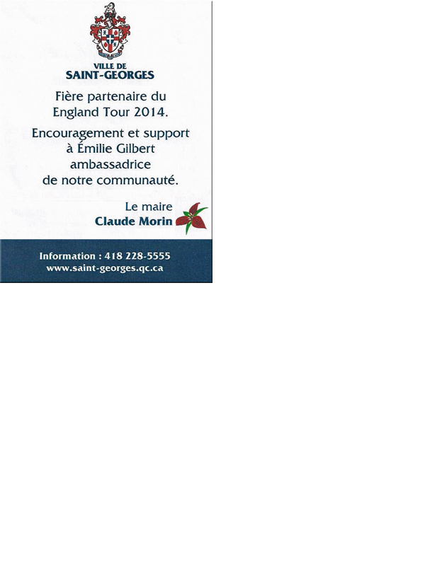 Bonjour ! Je m’appelle Émilie, j’ai 13 ans et j’ai découvert la passion du soccer à l’âge de dix ans. J’ai débuté avec le VOLCANO de Saint-Georges. L’année dernière je me suis joint à l’ARMADA de la Chaudière-Est AA et cette année, j’ai été sélectionné avec le CRSA U-14 AAA. Je peux vous dire qu’il faut aimer ça le soccer pour faire l’aller-retour Saint-Georges-Québec trois fois par semaine ! Je suis reconnu pour ma grande détermination et pour mon esprit d’équipe. Mes positions régulières sont demi-latérale et attaquante mais je suis polyvalente sur le terrain. Les camps de l’académie de soccer Pro-foot ont été pour moi très bénéfiques et je réalise un grand rêve en participant au England tour 2014. Je tiens remercier ma famille, mes amis ainsi qu’à tout les organisateurs de ce voyage exceptionnelle qui restera graver dans ma mémoire à jamais.